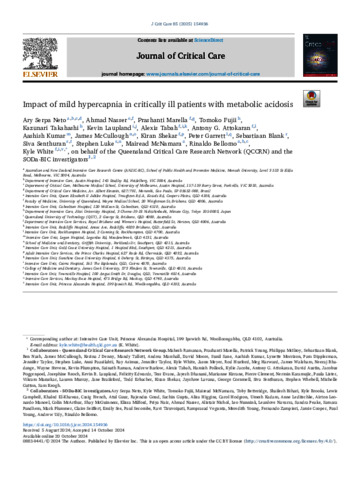 Serpa Neto, Ary, Nasser, Ahmad, Marella, Prashanti, Fujii, Tomoko, Takahashi, Kazunari, Laupland, Kevin, Tabah, Alexis, Attokaran, Antony G., Kumar, Aashish, McCullough, James, Shekar, Kiran, Garrett, Peter, Blank, Sebastiaan, Senthuran, Siva, Luke, Stephen, McNamara, Mairead, Bellomo, Rinaldo, and White, Kyle (2025) Impact of mild hypercapnia in critically ill patients with metabolic acidosis. Journal of Critical Care, 85. 154936.