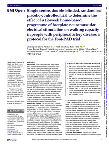 Askew, Christopher David, Windsor, Mark, Feka, Krist, Russell, Fraser Donald, Schaumberg, Mia, Walker, Meegan Anne, Neal, Bruce, Esterman, Adrian, Litewka, Lucas, and Golledge, Jonathan (2025) Single-centre, double-blinded, randomised placebo-controlled trial to determine the effect of a 12-week home-based programme of footplate neuromuscular electrical stimulation on walking capacity in people with peripheral artery disease: a protocol for the Foot-PAD trial. BMJ Open, 15 (1). e093162.