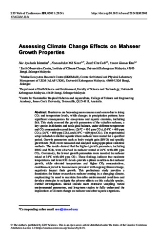 Iskandar, Nur Syuhada, Noor, Noorashikin Md, Cob, Zaidi Che, and Das, Simon Kumar (2025) Assessing Climate Change Effects on Mahseer Growth Properties. In: E3S Web Conferences (599) 02001. From: STACLIM 2024: 6th International Conference on Science and Technology Applications in Climate Change, 3-5 September 2024, Terengganu, Malaysia.