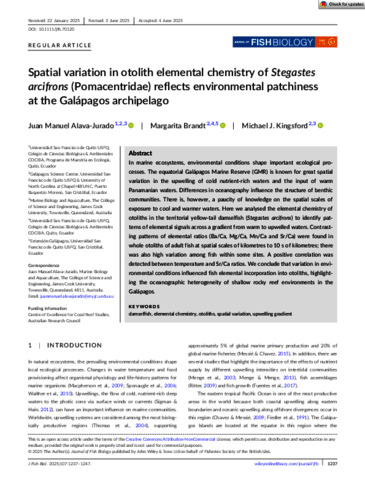 Alva-Jurado, Juan Manuel, Brandt, Margarita, and Kingsford, Michael J. (2025) Spatial variation in otolith elemental chemistry of Stegastes arcifrons (Pomacentridae) reflects environmental patchiness at the Galápagos archipelago. Journal of Fish Biology, 107 (4). pp. 1237-1247.
