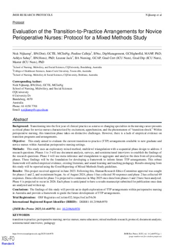 Nijkamp, Nick, Calleja, Pauline, Sahay, Ashlyn, and Jack, Leanne (2025) Evaluation of the Transition-to-Practice Arrangements for Novice Perioperative Nurses: Protocol for a Mixed Methods Study. JMIR Research Protocols, 14. e64970.