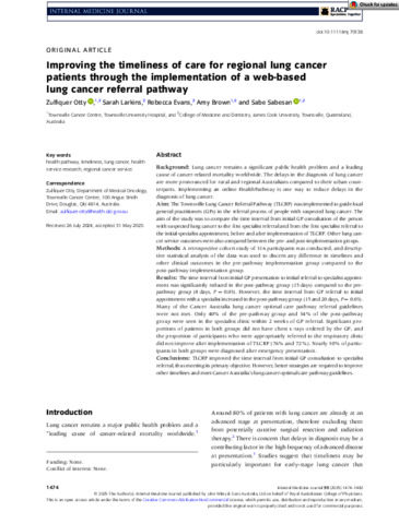 Otty, Zulfiquer, Larkins, Sarah, Evans, Rebecca, Brown, Amy, and Sabesan, Sabe (2025) Improving the timeliness of care for regional lung cancer patients through the implementation of a web-based lung cancer referral pathway. Internal Medicine Journal, 55 (9). pp. 1474-1482.
