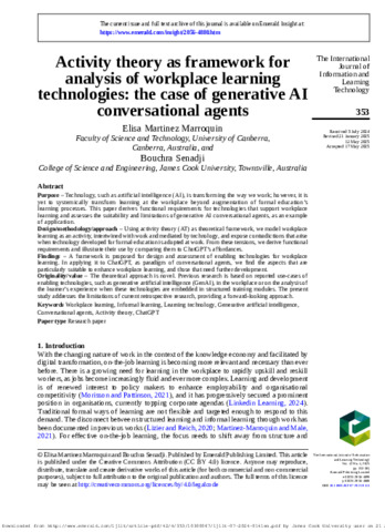 Martinez Marroquin, Elisa, and Senadji, Bouchra (2025) Activity theory as framework for analysis of workplace learning technologies: the case of generative AI conversational agents. International Journal of Information and Learning Technology, 42 (4). pp. 353-365.