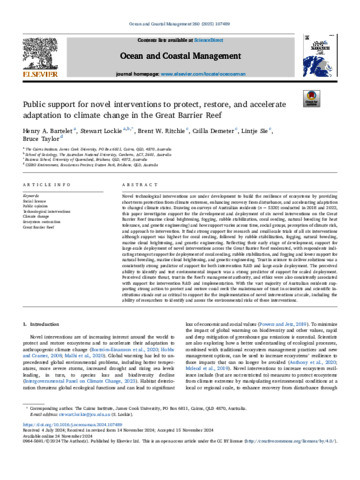 Bartelet, Henry A., Lockie, Stewart, Ritchie, Brent W., Demeter, Csilla, Sie, Lintje, and Taylor, Bruce (2025) Public support for novel interventions to protect, restore, and accelerate adaptation to climate change in the Great Barrier Reef. Ocean and Coastal Management, 260. 107489.