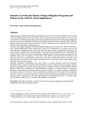 Weber, Max, Chaiechi, Taha, and Beg, Rabiul (2022) Inclusive Growth and Climate Change Mitigation Programs and Policies in the ASEAN: Fiscal Implications. Bulletin of Applied Economics, 9 (2). pp. 189-221.