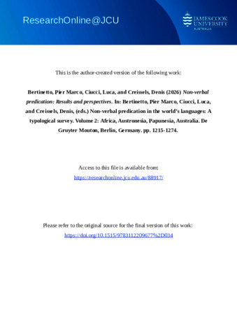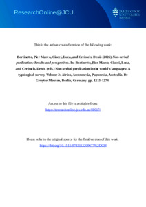 Bertinetto, Pier Marco, Ciucci, Luca, and Creissels, Denis (2026) Non-verbal predication: Results and perspectives. In: Bertinetto, Pier Marco, Ciucci, Luca, and Creissels, Denis, (eds.) Non-verbal predication in the world’s languages: A typological survey. Volume 2: Africa, Austronesia, Papunesia, Australia. Comparative Handbooks of Linguistics, 2 . De Gruyter Mouton, Berlin, Germany, pp. 1215-1274.