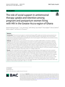 Introduction The role of social support in antiretroviral therapy (ART) uptake and retention among pregnant and postpartum women in Ghana’s capital, Accra, has received limited attention in the literature. This cross-sectional study extends existing knowledge by investigating the role of social support in ART adherence and retention among pregnant and postpartum women in Accra.