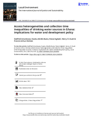 Amankwaa, Godfred, Abrefa Busia, Kwaku, Agbadi, Pascal, Duah, Henry O., and Arthur-Holmes, Francis (2024) Access heterogeneities and collection time inequalities of drinking water sources in Ghana: implications for water and development policy. Local Environment, 29 (3). pp. 263-278.