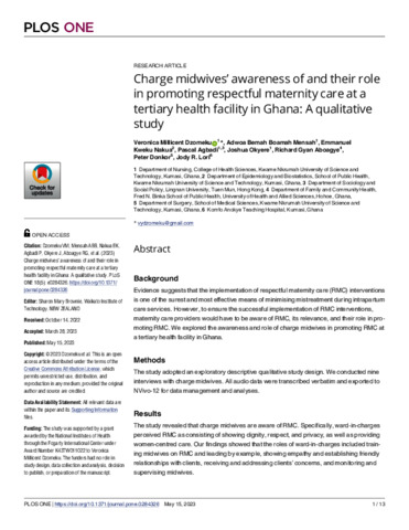 Dzomeku, Veronica Millicent, Boamah Mensah, Adwoa Bemah, Nakua, Emmanuel Kweku, Agbadi, Pascal, Okyere, Joshua, Aboagye, Richard Gyan, Donkor, Peter, and Lori, Jody R. (2023) Charge midwives’ awareness of and their role in promoting respectful maternity care at a tertiary health facility in Ghana: A qualitative study. PLoS ONE, 18 (5). e0284326.