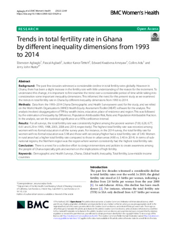 Agbaglo, Ebenezer, Agbadi, Pascal, Tetteh, Justice Kanor, Ameyaw, Edward Kwabena, Adu, Collins, and Nutor, Jerry John (2022) Trends in total fertility rate in Ghana by different inequality dimensions from 1993 to 2014. BMC Women's Health, 22 (1). 49.