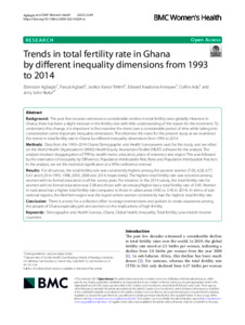 Background: The past few decades witnessed a considerable decline in total fertility rates globally. However in Ghana, there has been a slight increase in the fertility rate with little understanding of the reason for the increment. To understand this change, it is important to first examine the trend over a considerable period of time while taking into consideration some important inequality dimensions. This informed the need for this present study as we examined the trends in total fertility rate in Ghana by different inequality dimensions from 1993 to 2014.