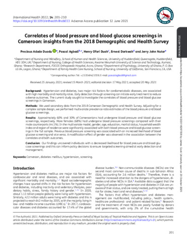 | Keywords: | Cameroon, diabetes mellitus, hypertension, screening |