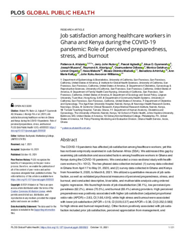 Afulani, Patience A., Nutor, Jerry John, Agbadi, Pascal, Gyamerah, Akua O., Musana, Joseph, Aborigo, Raymond A., Odiase, Osamuedeme, Getahun, Monica, Ongeri, Linnet, Malechi, Hawa, Madadi, Moses Obimbo, Arhinful, Benedicta, Kelly, Ann Marie, and Awoonor-Williams, John Koku (2021) Job satisfaction among healthcare workers in Ghana and Kenya during the COVID-19 pandemic: Role of perceived preparedness, stress, and burnout. PLOS Global Public Health, 1 (10). e0000022.