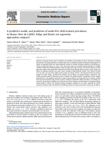 Aheto, Justice Moses K., Duah, Henry Ofori, Agbadi, Pascal, and Nakua, Emmanuel Kweku (2021) A predictive model, and predictors of under-five child malaria prevalence in Ghana: How do LASSO, Ridge and Elastic net regression approaches compare? Preventive Medicine Reports, 23. 101475.