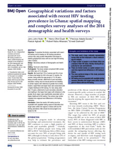 Nutor, Jerry John, Duah, Henry Ofori, Duodu, Precious Adade, Agbadi, Pascal, Alhassan, Robert Kaba, and Darkwah, Ernest (2021) Geographical variations and factors associated with recent HIV testing prevalence in Ghana: Spatial mapping and complex survey analyses of the 2014 demographic and health surveys. BMJ Open, 11 (7). e045458.