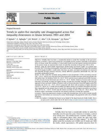 Agbadi, P., Agbaglo, E., Tetteh, J.K., Adu, C., Ameyaw, E.K., and Nutor, J.J. (2021) Trends in under-five mortality rate disaggregated across five inequality dimensions in Ghana between 1993 and 2014. Public Health, 196. pp. 95-100.
