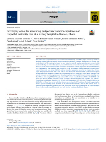 Dzomeku, Veronica Millicent, Boamah Mensah, Adwoa Bemah, Nakua, Kweku Emmanuel, Agbadi, Pascal, Lori, Jody R., and Donkor, Peter (2020) Developing a tool for measuring postpartum women's experiences of respectful maternity care at a tertiary hospital in Kumasi, Ghana. Heliyon, 6 (7). e04374.