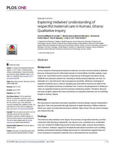 D-Zomeku, Veronica Millicent, Mensah, Bemah Adwoa Boamah, Nakua, Emmanuel Kweku, Agbadi, Pascal, Lori, Jody R., and Donkor, Peter (2020) Exploring midwives' understanding of respectful maternal care in Kumasi, Ghana: Qualitative inquiry. PLoS ONE, 15 (8). e0220538.