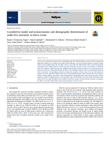 Tagoe, Eunice Twumwaa, Agbadi, Pascal, Nakua, Emmanuel K., Duodu, Precious Adade, Nutor, Jerry John, and Aheto, Justice Moses K. (2020) A predictive model and socioeconomic and demographic determinants of under-five mortality in Sierra Leone. Heliyon, 6 (3). e03508.