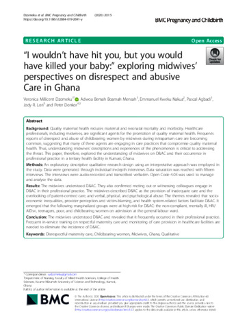 Dzomeku, Veronica Millicent, Boamah Mensah, Adwoa Bemah, Nakua, Emmanuel Kweku, Agbadi, Pascal, Lori, Jody R., and Donkor, Peter (2020) "i wouldn't have hit you, but you would have killed your baby:" Exploring midwives' perspectives on disrespect and abusive Care in Ghana. BMC Pregnancy and Childbirth, 20 (1). 15.