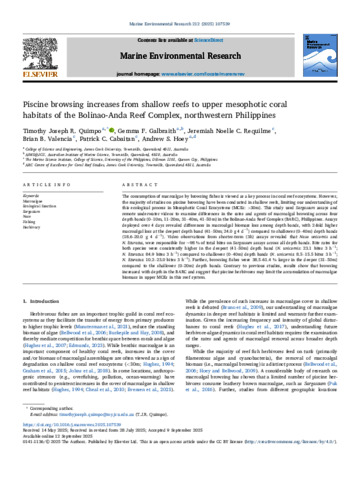 Quimpo, Timothy Joseph R., Galbraith, Gemma F., Requilme, Jeremiah Noelle C., Valencia, Brian B., Cabaitan, Patrick C., and Hoey, Andrew S. (2025) Piscine browsing increases from shallow reefs to upper mesophotic coral habitats of the Bolinao-Anda Reef Complex, northwestern Philippines. Marine Environmental Research, 212. 107539.