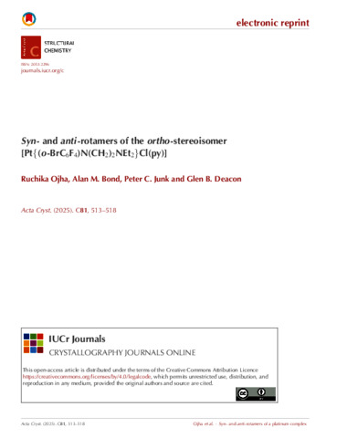 Ojha, Ruchika, Bond, Alan M., Junk, Peter C., and Deacon, Glen B. (2025) Syn- and anti-rotamers of the ortho-stereoisomer [Pt{(o-BrC6F4)N(CH2)2NEt2}Cl(py)]. Acta Crystallographica Section C Structural Chemistry, 81 (Pt 9). pp. 513-518.