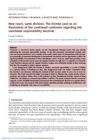 O'Sullivan, Carmel (2022) New Court, Same Division: The Bemba Case as an Illustration of the Continued Confusion regarding the Command Responsibility Doctrine. Leiden Journal of International Law, 35 (3). pp. 661-678.