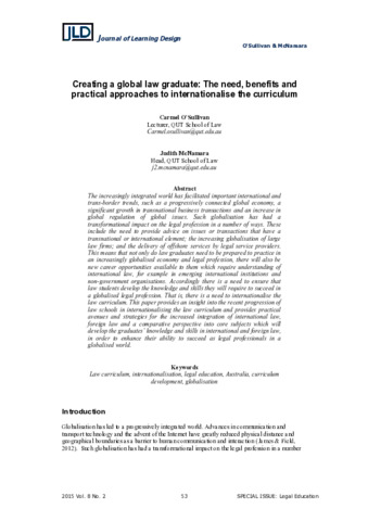 O'Sullivan, Carmel, and McNamara, Judith (2015) Creating a Global Law Graduate: The Need, Benefits and Practical Approaches to Internationalise the Curriculum. Journal of Learning Design, 8 (2). pp. 53-65.