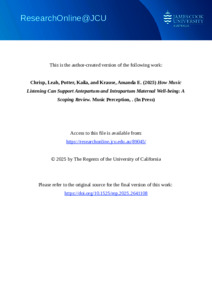Chrisp, Leah, Putter, Kaila, and Krause, Amanda E. (2025) How Music Listening Can Support Antepartum and Intrapartum Maternal Well-being: A Scoping Review. Music Perception. (In Press)