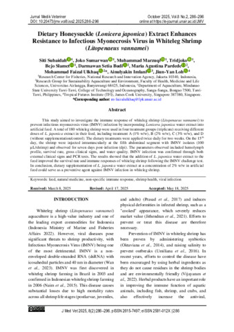 Subaidah, Siti, Sumarwan, Joko, Marzuqi, Muhammad, Tridjoko, Tridjoko, Slamet, Bejo, Budi, Darmawan Setia, Pardede, Maria Agustina, Ulkhaq, Mohammad Faizal, Imlani, Ainulyakin, and Loh, James (2025) Dietary Honeysuckle (Lonicera japonica) Extract Enhances Resistance to Infectious Myonecrosis Virus in Whiteleg Shrimp (Litopenaeus vannamei). Jurnal Medik Veteriner, 8 (2). pp. 286-296.