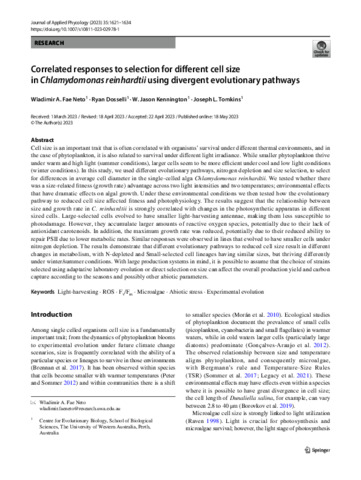 Fae Neto, Wladimir A., Dosselli, Ryan, Kennington, W. Jason, and Tomkins, Joseph L. (2023) Correlated responses to selection for different cell size in Chlamydomonas reinhardtii using divergent evolutionary pathways. Journal of Applied Phycology, 35. pp. 1621-1634.