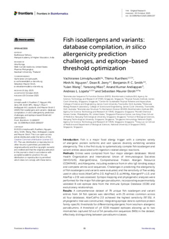 Limviphuvadh, Vachiranee, Ruethers, Thimo, Nguyen, Minh N., Jerry, Dean R., Smith, Benjamin P.C., Wang, Yulan, Miao, Yansong, Andiappan, Anand Kumar, Lopata, Andreas L., and Maurer-Stroh, Sebastian (2025) Fish isoallergens and variants: database compilation, in silico allergenicity prediction challenges, and epitope-based threshold optimization. Frontiers in Bioinformatics, 5. 1669237.