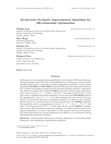 Lian, Yuefang, Wang, Xiao, Xu, Dachuan, and Zhao, Zhongrui (2024) Zeroth-order Stochastic Approximation Algorithms for DR-submodular Optimization. Journal of Machine Learning Research, 25. pp. 1-55.