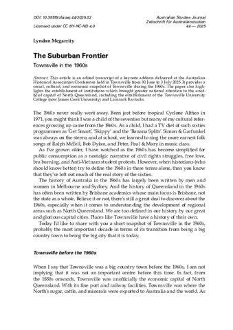 Megarrity, Lyndon (2025) The Suburban Frontier: Townsville in the 1960s. Australian Studies Journal, 44. pp. 13-28.