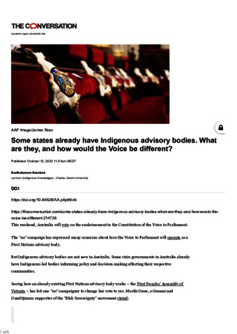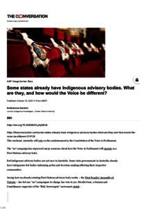 Stanford, Bartholomew (2023) Some states already have Indigenous advisory bodies. What are they, and how would the Voice be different? The Conversation, 12 October 2023.