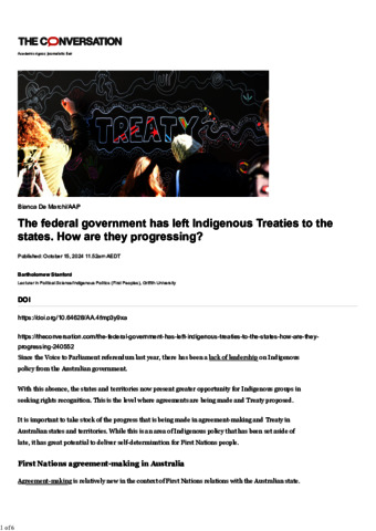 Stanford, Bartholomew (2024) The federal government has left Indigenous Treaties to the states. How are they progressing? The Conversation, 15 October 2024.