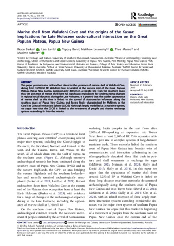 Barker, Bryce, Lamb, Lara, Beni, Teppsy, Leavesley, Matthew, Manne, Tiina, and Aubert, Maxime (2025) Marine shell from Walufeni Cave and the origins of the Kasua: Implications for Late Holocene socio-cultural interaction on the Great Papuan Plateau, Papua New Guinea. Australian Archaeology, 91 (2). pp. 185-196.