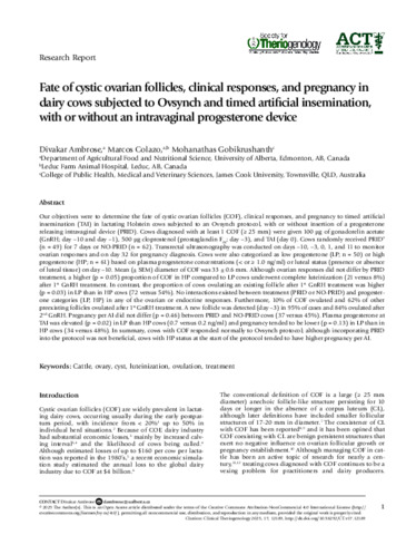Ambrose, Divakar, Colazo, Marcos, and Gobikrushanth, Mohanathas (2025) Fate of cystic ovarian follicles, clinical responses, and pregnancy in dairy cows subjected to Ovsynch and timed artificial insemination, with or without an intravaginal progesterone device. Clinical Theriogenology, 17. (In Press)