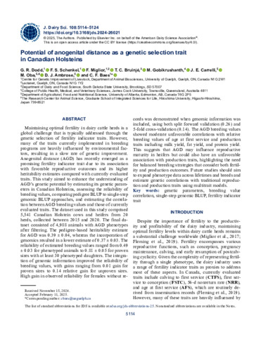 Dodd, G., Schenkel, F.S., Miglior, F., Bruinjé, T.C., Gobikrushanth, M., Carrelli, J.E., Oba, M., Ambrose, D.J., and Baes, C.F. (2025) Potential of anogenital distance as a genetic selection trait in Canadian Holsteins. Journal of Dairy Science, 108 (5).