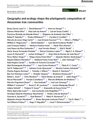 Luize, Bruno Garcia, Bauman, David, Ter Steege, Hans, Palma‐Silva, Clarisse, do Amaral, Iêda Leão, de Souza Coelho, Luiz, de Almeida Matos, Francisca Dionízia, de Andrade Lima Filho, Diógenes, Salomão, Rafael, Wittmann, Florian, Castilho, Carolina V., de Jesus Veiga Carim, Marcelo, Guevara, Juan Ernesto, Phillips, Oliver L., Magnusson, William E., Sabatier, Daniel, Revilla, Juan David Cardenas, Molino, Jean‐François, Irume, Mariana Victória, Martins, Maria Pires, da Silva Guimarães, José Renan, Ramos, José Ferreira, Bánki, Olaf S., Piedade, Maria Teresa Fernandez, López, Dairon Cárdenas, Pitman, Nigel C. A., Demarchi, Layon O., Schöngart, Jochen, de Leão Novo, Evlyn Márcia Moraes, Vargas, Percy Núñez, Silva, Thiago Sanna Freire, Venticinque, Eduardo Martins, Manzatto, Angelo Gilberto, Reis, Neidiane Farias Costa, Terborgh, John, Casula, Katia Regina, Honorio Coronado, Euridice N., Mendoza, Abel Monteagudo, Montero, Juan Carlos, Costa, Flávia R. C., Feldpausch, Ted R., Quaresma, Adriano Costa, Arboleda, Nicolás Castaño, Zartman, Charles Eugene, Killeen, Timothy J., Marimon, Beatriz S., Marimon‐Junior, Ben Hur, Vasquez, Rodolfo, Mostacedo, Bonifacio, Assis, Rafael L., Baraloto, Chris, do Amaral, Dário Dantas, Engel, Julien, Petronelli, Pascal, Castellanos, Hernán, de Medeiros, Marcelo Brilhante, Simon, Marcelo Fragomeni, Andrade, Ana, Camargo, José Luís, Laurance, William F., Laurance, Susan G.W., Rincón, Lorena Maniguaje, Schietti, Juliana, Sousa, Thaiane R., de Sousa Farias, Emanuelle, Lopes, Maria Aparecida, Magalhães, José Leonardo Lima, Nascimento, Henrique Eduardo Mendonça, de Queiroz, Helder Lima, Aymard C, Gerardo A., Brienen, Roel, Stevenson, Pablo R., Araujo‐Murakami, Alejandro, Cintra, Bruno Barçante Ladvocat, Baker, Tim R., Feitosa, Yuri Oliveira, Mogollón, Hugo F., Duivenvoorden, Joost F., Peres, Carlos A., Silman, Miles R., Ferreira, Leandro Valle, Lozada, José Rafael, Comiskey, James A., de Toledo, José Julio, Damasco, Gabriel, Dávila, Nállarett, Draper, Freddie C., García‐Villacorta, Roosevelt, Lopes, Aline, Vicentini, Alberto, Valverd, Fernando Cornejo, Alonso, Alfonso, Arroyo, Luzmila, Dallmeier, Francisco, Gomes, Vitor H. F., Jimenez, Eliana M., Neill, David, Mora, Maria Cristina Peñuela, Noronha, Janaína Costa, de Aguiar, Daniel P. P., Barbosa, Flávia Rodrigues, Bredin, Yennie K., de Sá Carpanedo, Rainiellen, Carvalho, Fernanda Antunes, de Souza, Fernanda Coelho, Feeley, Kenneth J., Gribel, Rogerio, Haugaasen, Torbjørn, Hawes, Joseph E., Pansonato, Marcelo Petratti, Paredes, Marcos Ríos, de Jesus Rodrigues, Domingos, Barlow, Jos, Berenguer, Erika, da Silva, Izaias Brasil, Ferreira, Maria Julia, Ferreira, Joice, Fine, Paul V. A., Guedes, Marcelino Carneiro, Levis, Carolina, Licona, Juan Carlos, Zegarra, Boris Eduardo Villa, Vos, Vincent Antoine, Cerón, Carlos, Durgante, Flávia Machado, Fonty, Émile, Henkel, Terry W., Householder, John Ethan, Huamantupa‐Chuquimaco, Isau, Silveira, Marcos, Stropp, Juliana, Thomas, Raquel, Daly, Doug, Millike, William, Molina, Guido Pardo, Pennington, Toby, Vieira, Ima Célia Guimarães, Albuquerque, Bianca Weiss, Campelo, Wegliane, Fuentes, Alfredo, Klitgaard, Bente, Pena, José Luis Marcelo, Tello, J. Sebastián, Vriesendorp, Corine, Chave, Jerome, Di Fiore, Anthony, Hilário, Renato Richard, de Oliveira Pereira, Luciana, Phillips, Juan Fernando, Rivas‐Torres, Gonzalo, van Andel, Tinde R., von Hildebrand, Patricio, Balee, William, Barbosa, Edelcilio Marques, de Matos Bonates, Luiz Carlos, Doza, Hilda Paulette Dávila, Gómez, Ricardo Zárate, Gonzales, Therany, Gonzales, George Pepe Gallardo, Hoffman, Bruce, Junqueira, André Braga, Malhi, Yadvinder, de Andrade Miranda, Ires Paula, Pinto, Linder Felipe Mozombite, Prieto, Adriana, Rudas, Agustín, Ruschel, Ademir R., Silva, Natalino, Vela, César I. A., Zent, Stanford, Zent, Egleé L., Cano, Angela, Márquez, Yrma Andreina Carrero, Correa, Diego F., Costa, Janaina Barbosa Pedrosa, Flores, Bernardo Monteiro, Galbraith, David, Holmgren, Milena, Kalamandeen, Michelle, Lobo, Guilherme, Montenegro, Luis Torres, Nascimento, Marcelo Trindade, Oliveira, Alexandre A., Pombo, Maihyra Marina, Ramirez‐Angulo, Hirma, Rocha, Maira, Scudeller, Veridiana Vizoni, Umaña, Maria Natalia, van der Heijden, Geertje, Torre, Emilio Vilanova, Reategui, Manuel Augusto Ahuite, Baider, Cláudia, Balslev, Henrik, Cárdenas, Sasha, Casas, Luisa Fernanda, Farfan‐Rios, William, Ferreira, Cid, Linares‐Palomino, Reynaldo, Mendoza, Casimiro, Mesones, Italo, Parada, Germaine Alexander, Torres‐Lezama, Armando, Giraldo, Ligia Estela Urrego, Villarroel, Daniel, Zagt, Roderick, Alexiades, Miguel N., de Oliveira, Edmar Almeida, Garcia‐Cabrera, Karina, Hernandez, Lionel, Cuenca, Walter Palacios, Pansini, Susamar, Pauletto, Daniela, Arevalo, Freddy Ramirez, Sampaio, Adeilza Felipe, Valderrama Sandoval, Elvis H., Gamarra, Luis Valenzuela, Dexter, Kyle G., and UNSPECIFIED (2024) Geography and ecology shape the phylogenetic composition of Amazonian tree communities. Journal of Biogeography, 51. pp. 1163-1184.