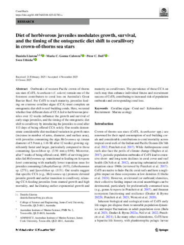 Llarena, Daniela, Gomez Cabrera, Maria, Doll, Peter, and Uthicke, Sven (2025) Diet of herbivorous juveniles modulates growth, survival, and the timing of the ontogenetic diet shift to corallivory in crown-of-thorns sea stars. Coral Reefs. (In Press)