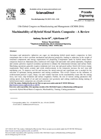 Xavior, M. Anthony, and Ajith Kumar, J.P. (2017) Machinability of Hybrid Metal Matrix Composite - A Review. In: Procedia Engineering (174) pp. 1110-1118. From: GCMM 2016: 13th Global Congress on Manufacturing and Management, 28-30 November 2016, Zhengzhou, China.