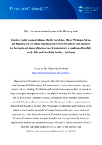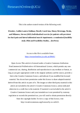 Prentice, Caitlin Lauren Siobhan, Flavell, Carol Ann, Massy-Westropp, Nicola, and Milanese, Steven (2025) Individualised exercise for patients with persistent low back pain and lateral abdominal muscle impairments: a randomised feasibility study. Pilot and Feasibility Studies. (In Press)
