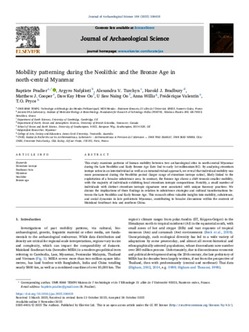 Pradier, Baptiste, Nafplioti, Argyro, Turchyn, Alexandra V., Bradbury, Harold J., Cooper, Matthew J., Htwe Oo, Daw Kay, Naing Oo, U. Saw, Willis, Anna, Valentin, Frédérique, and Pryce, T.O. (2025) Mobility patterning during the Neolithic and the Bronze Age in north-central Myanmar. Journal of Archaeological Science, 184. 106418.