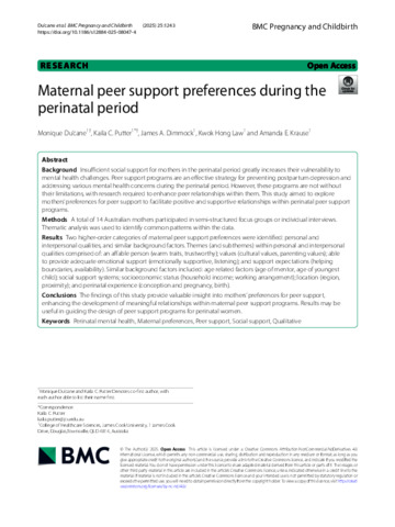 Du'cane, Monique, Putter, Kaila C., Dimmock, James A., Law, Kwok Hong, and Krause, Amanda E. (2025) Maternal peer support preferences during the perinatal period. BMC Pregnancy and Childbirth, 25. 1243.
