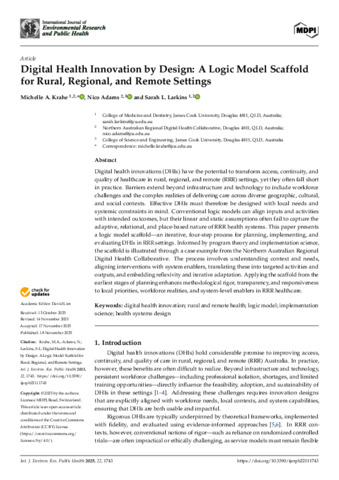 Krahe, Michelle A., Adams, Nico, and Larkins, Sarah L. (2025) Digital Health Innovation by Design: A Logic Model Scaffold for Rural, Regional, and Remote Settings. International Journal of Environmental Research and Public Health, 32 (11). 1743.