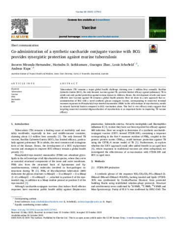 Miranda-Hernandez, Socorro, Sathkumara Mudiyanselage, Harindra, Zhao, Guangzu, Schofield, Louis, and Kupz, Andreas (2025) Co-administration of a synthetic saccharide conjugate vaccine with BCG provides synergistic protection against murine tuberculosis. Vaccine, 68. 127912.