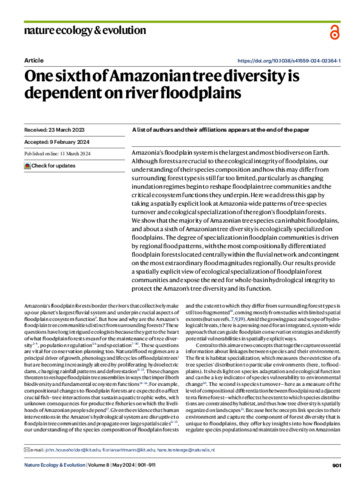 Householder, John Ethan, Wittmann, Florian, Schöngart, Jochen, Piedade, Maria Teresa Fernandez, Junk, Wolfgang J., Latrubesse, Edgardo Manuel, Quaresma, Adriano Costa, Demarchi, Layon O., de S. Lobo, Guilherme, De Aguiar, Daniel P. P. de, Assis, Rafael L., Lopes, Aline, Parolin, Pia, Leão do Amaral, Iêda, Coelho, Luiz de Souza, de Almeida Matos, Francisca Dionízia, Lima Filho, Diógenes de Andrade, Salomão, Rafael P., Castilho, Carolina V., Guevara-Andino, Juan Ernesto, Carim, Marcelo de Jesus Veiga, Phillips, Oliver L., Cárdenas, Dairon, Magnusson, William E., Sabatier, Daniel, Revilla, Juan David Cardenas, Molino, Jean-françois, Irume, Mariana Victória, Martins, Maria Pires, Guimarães, José Renan da Silva, Ramos, José Ferreira, Rodrigues, Domingos de Jesus, Bánki, Olaf S., Peres, Carlos A., Pitman, Nigel C. A., Hawes, Joseph E., Almeida, Everton José, Barbosa, Luciane Ferreira, Cavalheiro, Larissa, dos Santos, Márcia Cléia Vilela, Luize, Bruno Garcia, Novo, Evlyn Márcia Moraes de Leão, Núñez Vargas, Percy, Silva, Thiago Sanna Freire, Venticinque, Eduardo Martins, Manzatto, Angelo Gilberto, Reis, Neidiane Farias Costa, Terborgh, John, Casula, Katia Regina, Costa, Flávia R. C., Honorio Coronado, Euridice N., Monteagudo Mendoza, Abel, Montero, Juan Carlos, Feldpausch, Ted R., Aymard C, Gerardo A., Baraloto, Chris, Castaño Arboleda, Nicolás, Engel, Julien, Petronelli, Pascal, Zartman, Charles Eugene, Killeen, Timothy J., Rincón, Lorena Maniguaje, Marimon, Beatriz S., Marimon-Junior, Ben Hur, Schietti, Juliana, Sousa, Thaiane R., Vasquez, Rodolfo, Mostacedo, Bonifacio, Dantas do Amaral, Dário, Castellanos, Hernán, Medeiros, Marcelo Brilhante de, Simon, Marcelo Fragomeni, Andrade, Ana, Camargo, José Luís, Laurance, William F., Laurance, Susan G. W., Farias, Emanuelle de Sousa, Lopes, Maria Aparecida, Magalhães, José Leonardo Lima, Mendonça Nascimento, Henrique Eduardo, Queiroz, Helder Lima de, Brienen, Roel, Stevenson, Pablo R., Araujo-Murakami, Alejandro, Baker, Tim R., Cintra, Bruno Barçante Ladvocat, Feitosa, Yuri Oliveira, Mogollón, Hugo F., Noronha, Janaína Costa, Barbosa, Flávia Rodrigues, de Sá Carpanedo, Rainiellen, Duivenvoorden, Joost F., Silman, Miles R., Ferreira, Leandro Valle, Levis, Carolina, Lozada, José Rafael, Comiskey, James A., Draper, Freddie C., Toledo, José Julio de, Damasco, Gabriel, Dávila, Nállarett, García-Villacorta, Roosevelt, Vicentini, Alberto, Cornejo Valverde, Fernando, Alonso, Alfonso, Arroyo, Luzmila, Dallmeier, Francisco, Gomes, Vitor H. F., Jimenez, Eliana M., Neill, David, Peñuela Mora, Maria Cristina, Carvalho, Fernanda Antunes, Coelho de Souza, Fernanda, Feeley, Kenneth J., Gribel, Rogerio, Pansonato, Marcelo Petratti, Ríos Paredes, Marcos, Barlow, Jos, Berenguer, Erika, Dexter, Kyle G., Ferreira, Joice, Fine, Paul V. A., Guedes, Marcelino Carneiro, Huamantupa-Chuquimaco, Isau, Licona, Juan Carlos, Pennington, Toby, Villa Zegarra, Boris Eduardo, Vos, Vincent Antoine, Cerón, Carlos, Fonty, Émile, Henkel, Terry W., Maas, Paul, Pos, Edwin, Silveira, Marcos, Stropp, Juliana, Thomas, Raquel, Daly, Doug, Milliken, William, Pardo Molina, Guido, Vieira, Ima Célia Guimarães, Albuquerque, Bianca Weiss, Campelo, Wegliane, Emilio, Thaise, Fuentes, Alfredo, Klitgaard, Bente, Marcelo Pena, José Luis, Souza, Priscila F., Tello, J. Sebastián, Vriesendorp, Corine, Chave, Jerome, Di Fiore, Anthony, Hilário, Renato Richard, Pereira, Luciana de Oliveira, Phillips, Juan Fernando, Rivas-Torres, Gonzalo, van Andel, Tinde R., von Hildebrand, Patricio, Balee, William, Barbosa, Edelcilio Marques, Bonates, Luiz Carlos de Matos, Doza, Hilda Paulette Dávila, Gómez, Ricardo Zárate, Gonzales, Therany, Gonzales, George Pepe Gallardo, Hoffman, Bruce, Junqueira, André Braga, Malhi, Yadvinder, Miranda, Ires Paula de Andrade, Mozombite-Pinto, Linder Felipe, Prieto, Adriana, Rudas, Agustín, Ruschel, Ademir R., Silva, Natalino, Vela, César I. A., Zent, Stanford, Zent, Egleé L., Cano, Angela, Carrero Márquez, Yrma Andreina, Correa, Diego F., Costa, Janaina Barbosa Pedrosa, Flores, Bernardo Monteiro, Galbraith, David, Holmgren, Milena, Kalamandeen, Michelle, Nascimento, Marcelo Trindade, Oliveira, Alexandre A., Ramirez-Angulo, Hirma, Rocha, Maira, Scudeller, Veridiana Vizoni, Sierra, Rodrigo, Tirado, Milton, Umaña, Maria Natalia, Van Der Heijden, Geertje, Vilanova Torre, Emilio, Ahuite Reategui, Manuel Augusto, Baider, Cláudia, Balslev, Henrik, Cárdenas, Sasha, Casas, Luisa Fernanda, Farfan-Rios, William, Ferreira, Cid, Linares-Palomino, Reynaldo, Mendoza, Casimiro, Mesones, Italo, Parada, Germaine Alexander, Torres-Lezama, Armando, Urrego Giraldo, Ligia Estela, Villarroel, Daniel, Zagt, Roderick, Alexiades, Miguel N., de Oliveira, Edmar Almeida, Garcia-Cabrera, Karina, Hernandez, Lionel, Palacios Cuenca, Walter, Pansini, Susamar, Pauletto, Daniela, Ramirez Arevalo, Freddy, Sampaio, Adeilza Felipe, Valderrama Sandoval, Elvis H., Valenzuela Gamarra, Luis, and ter Steege, Hans (2024) One sixth of Amazonian tree diversity is dependent on river floodplains. Nature Ecology & Evolution, 8 (5). pp. 901-911.