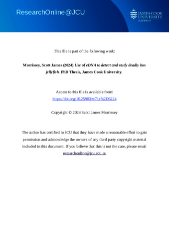 Morrissey, Scott James (2024) Use of eDNA to detect and study deadly box jellyfish. PhD thesis, James Cook University.