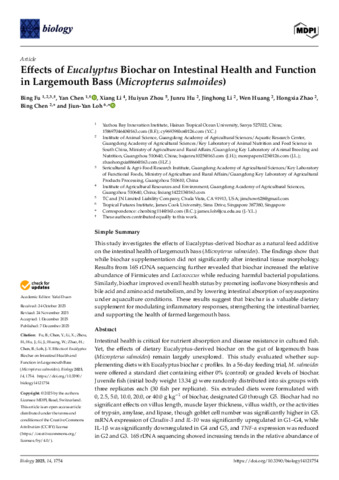 Fu, Bing, Chen, Yan, Li, Xiang, Zhou, Huiyun, Hu, Junru, Li, Jinghong, Huang, Wen, Zhao, Hongxia, Chen, Bing, and Loh, Jiun-Yan (2025) Effects of Eucalyptus Biochar on Intestinal Health and Function in Largemouth Bass (Micropterus salmoides). Biology, 14 (12). 1754.